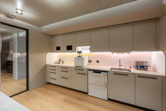 Eine detaillierte Analyse der Räumlichkeiten bildete die Grundlage für den Entwurf. Ziel war es, eine Umgebung zu gestalten, die fortschrittliche Technologie mit einem beruhigenden Gestaltungskonzept vereint. Die Farbgebung der Wände und Decken orientiert sich an sanften, erdigen Tönen – Juragrau und Lavagrau dominieren das Erscheinungsbild und korrespondieren harmonisch mit dem warmen Eichenboden. Diese Material- und Farbwahl trägt dazu bei, eine entspannte Atmosphäre zu erzeugen, die dem oft mit Stress behafteten Zahnarztbesuch entgegenwirkt. Der Empfangsbereich empfängt die Patienten mit warmem Holz und einer zurückhaltenden Beleuchtung, die gezielt eingesetzt wird, um Geborgenheit zu vermitteln. Im angrenzenden Wartebereich sorgen komfortable Sitzgelegenheiten für eine angenehme Aufenthaltsqualität und eine entspannte Wartezeit.